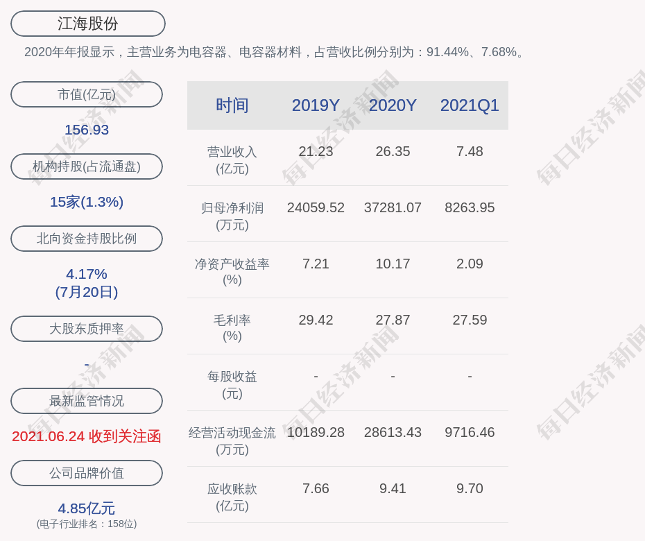 2020年年报显示,江海股份的主营业务为电容器、电容器材料,占营收比例分别为:91.44%、7.68%。