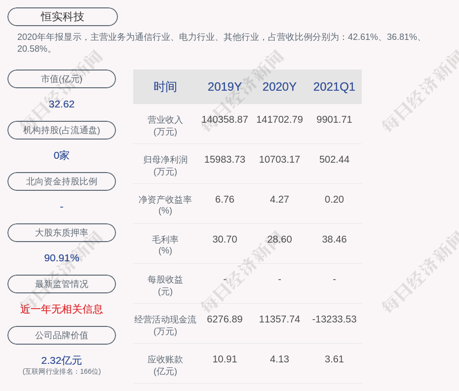 2020年年报显示,恒实科技的主营业务为通信行业、电力行业、其他行业,占营收比例分别为:42.61%、36.81%、20.58%。