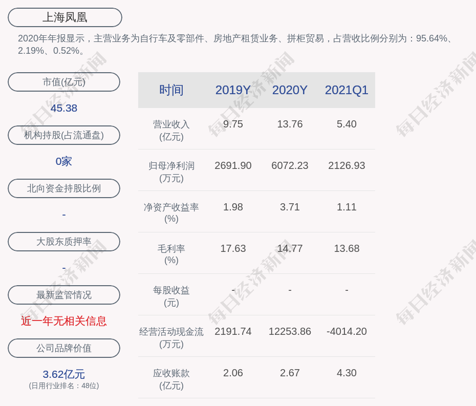 2020年年报显示,上海凤凰的主营业务为自行车及零部件、房地产租赁业务、拼柜贸易,占营收比例分别为:95.64%、2.19%、0.52%。