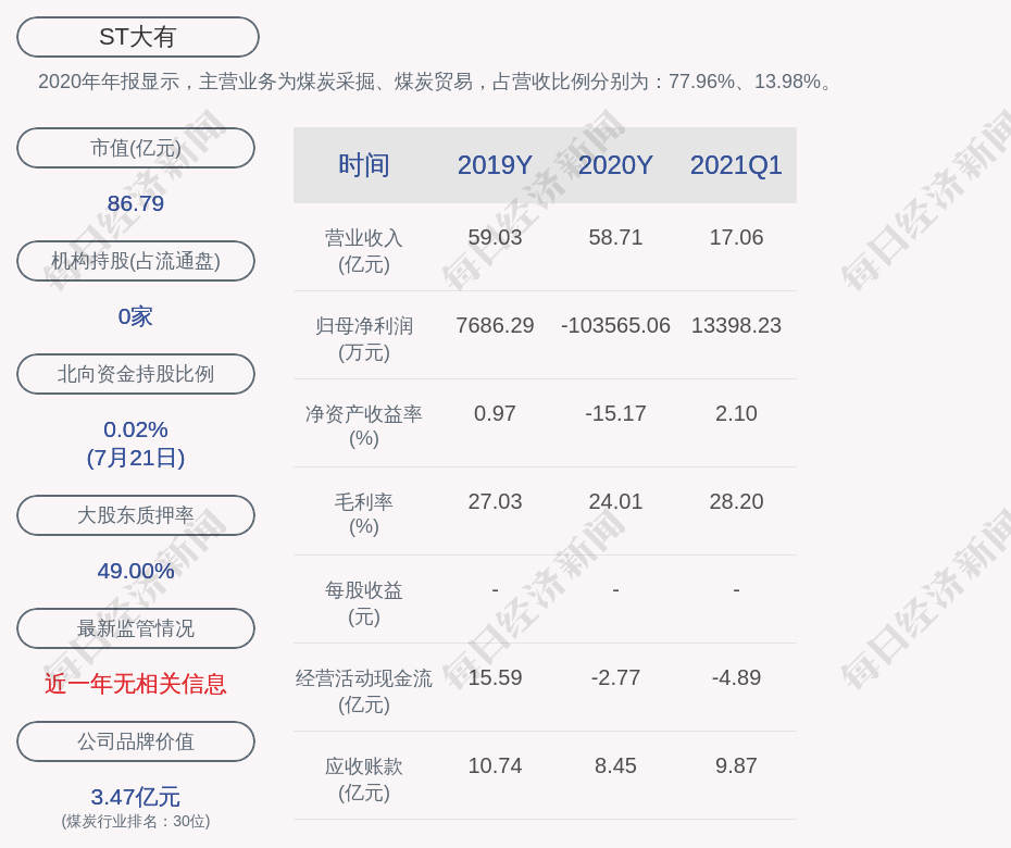 2020年年报显示,ST大有的主营业务为煤炭采掘、煤炭贸易,占营收比例分别为:77.96%、13.98%。
