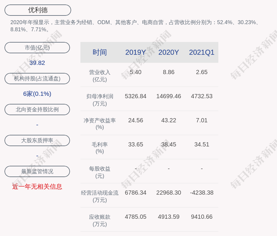 2020年年报显示,优利德的主营业务为经销、ODM、其他客户、电商自营,占营收比例分别为:52.4%、30.23%、8.81%、7.71%。