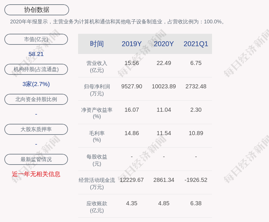 2020年年报显示,协创数据的主营业务为计算机和通信和其他电子设备制造业,占营收比例为:100.0%。