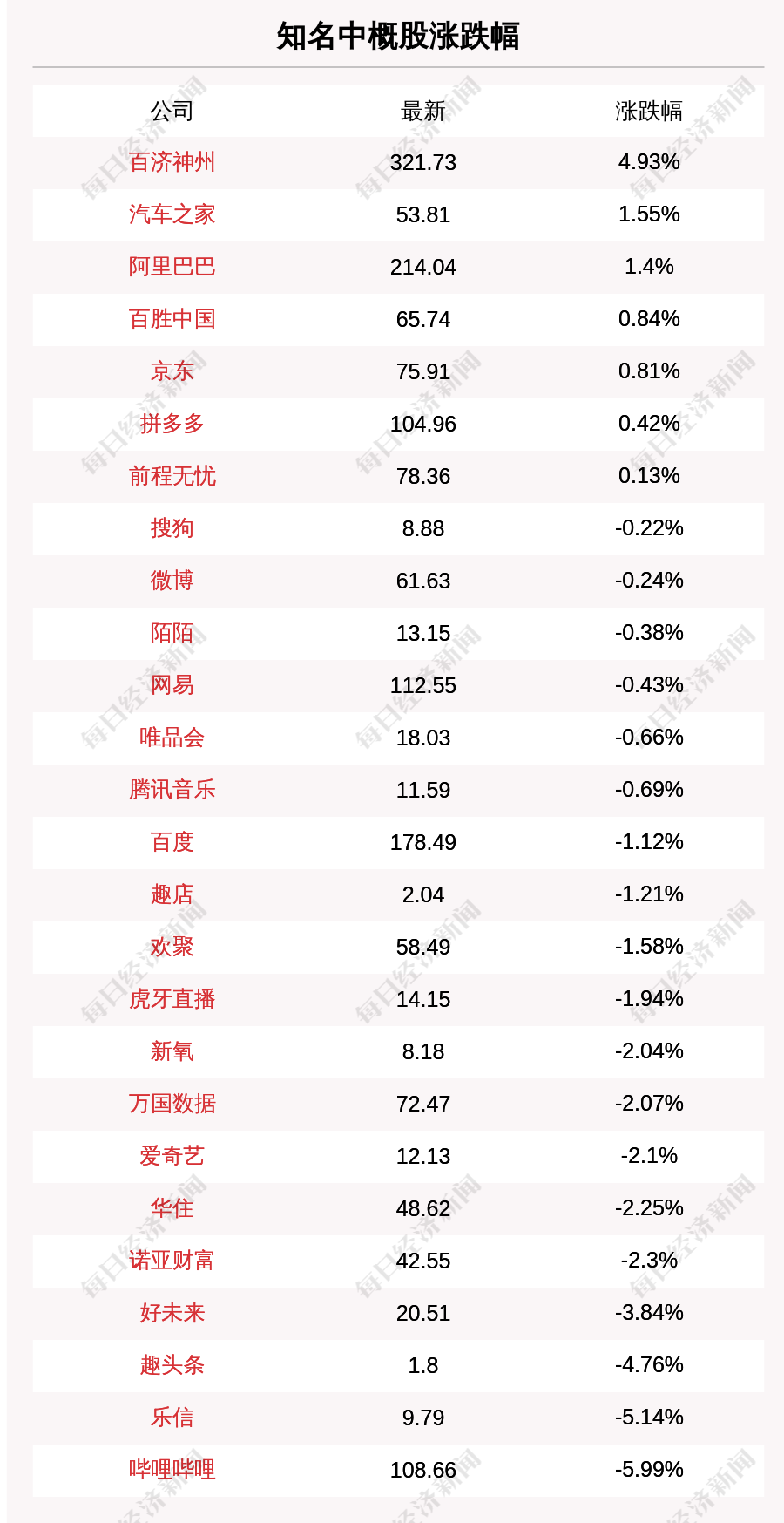 每经AI快讯:北京时间7月23日05:30,知名中概股中百济神州、汽车之家、阿里巴巴、百胜中国、京东涨幅居前,收盘分别上涨4.93%、1.55%、1.4%、0.84%、0.81%。哔哩哔哩、乐信、趣头条、好未来、诺亚财富跌幅居前,收盘分别下跌5.99%、5.14%、4.76%、3.84%、2.3%。