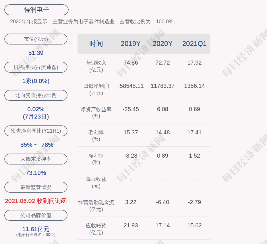 2020年年报显示,得润电子的主营业务为电子器件制造业,占营收比例为:100.0%。