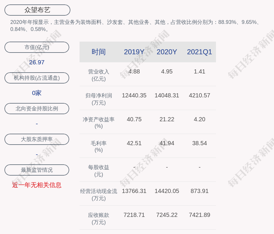 2020年年报显示,众望布艺的主营业务为装饰面料、沙发套、其他业务、其他,占营收比例分别为:88.93%、9.65%、0.84%、0.58%。