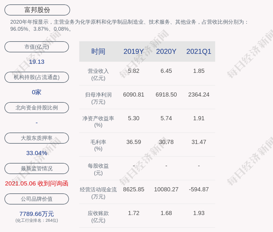 2020年年报显示,富邦股份的主营业务为化学原料和化学制品制造业、技术服务、其他业务,占营收比例分别为:96.05%、3.87%、0.08%。