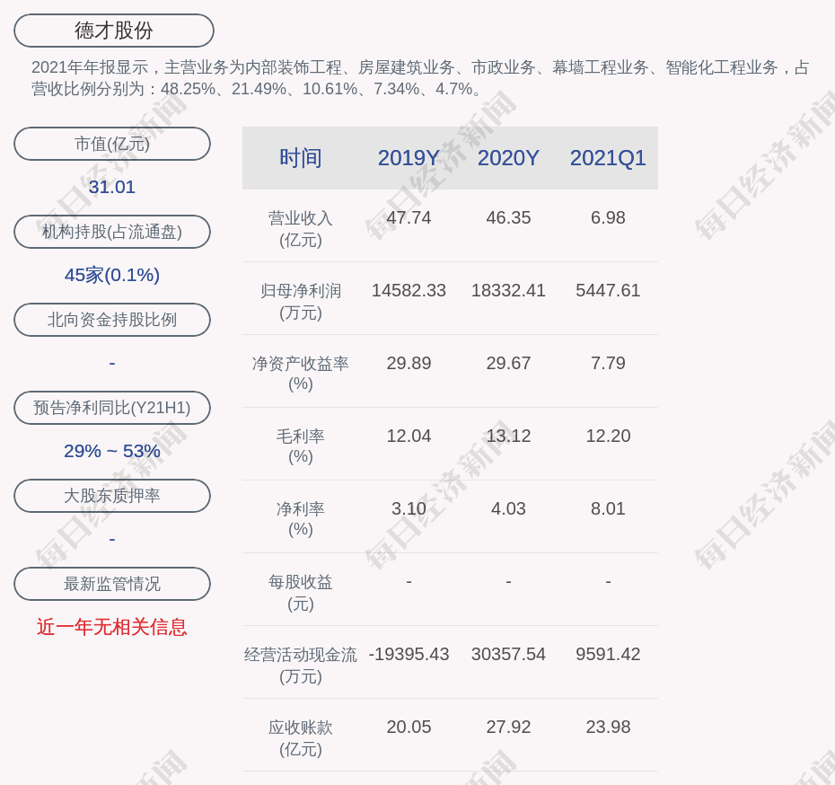 2021年年报显示,德才股份的主营业务为内部装饰工程、房屋建筑业务、市政业务、幕墙工程业务、智能化工程业务,占营收比例分别为:48.25%、21.49%、10.61%、7.34%、4.7%。