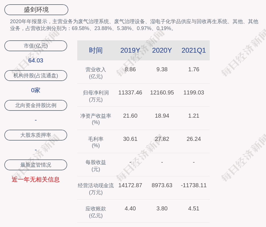 2020年年报显示,盛剑环境的主营业务为废气治理系统、废气治理设备、湿电子化学品供应与回收再生系统、其他、其他业务,占营收比例分别为:69.58%、23.88%、5.38%、0.97%、0.19%。