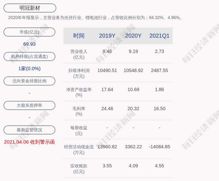 2020年年报显示,明冠新材的主营业务为光伏行业、锂电池行业,占营收比例分别为:94.32%、4.96%。