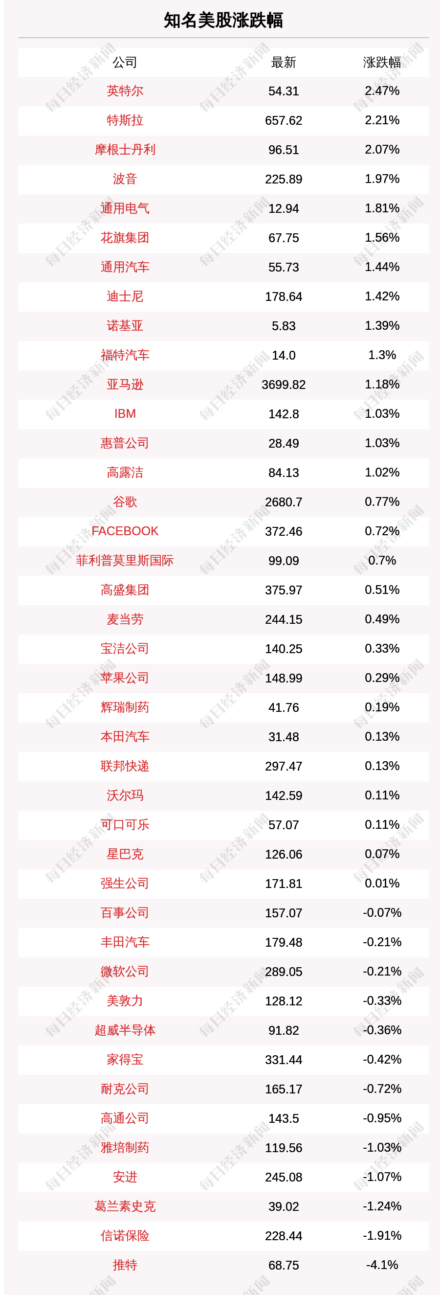 每经AI快讯:北京时间7月27日05:30,知名美股中英特尔、特斯拉、摩根士丹利、波音、通用电气涨幅居前,收盘分别上涨2.47%、2.21%、2.07%、1.97%、1.81%。推特、信诺保险、葛兰素史克、安进、雅培制药跌幅居前,收盘分别下跌4.1%、1.91%、1.24%、1.07%、1.03%。
