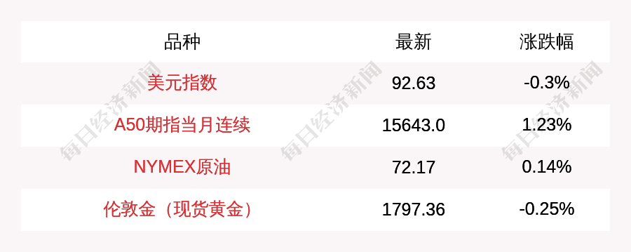 每经AI快讯:北京时间7月27日05:00,富时中国A50指数期货上涨190.0点,涨幅为1.23%,报15643.0点;NYMEX原油收盘上涨0.1点,涨幅为0.14%,报72.17点;美元指数收盘下跌0.28点,跌幅为0.3%,报92.63点;伦敦金(现货黄金)收盘下跌4.42点,跌幅为0.25%,报1797.36点。