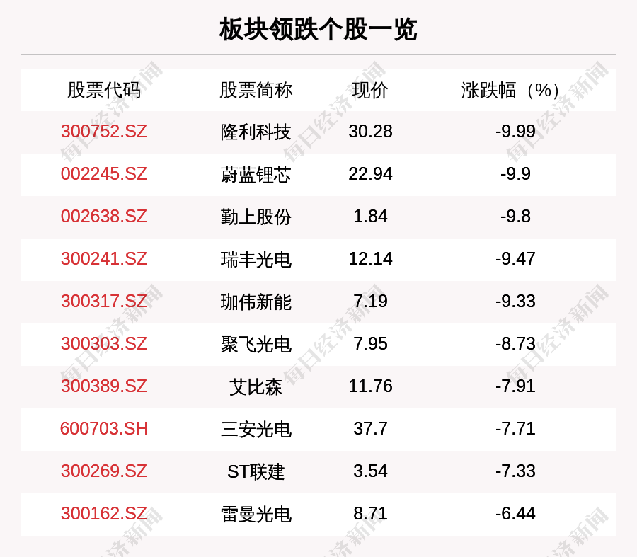 每经AI快讯,LED板块走弱,板块内44只下跌,1只平盘,23只上涨,隆利科技、蔚蓝锂芯、勤上股份分别跌9.99%、9.9%、9.8%。