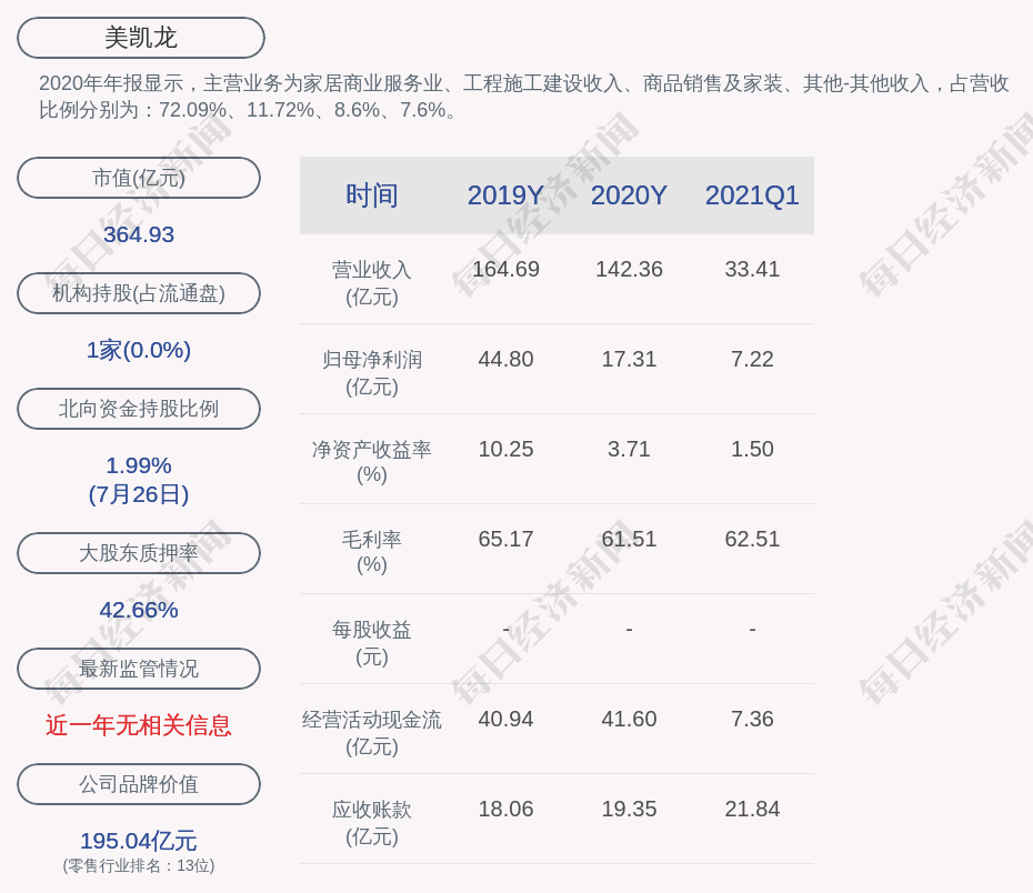 2020年年报显示,美凯龙的主营业务为家居商业服务业、工程施工建设收入、商品销售及家装、其他-其他收入,占营收比例分别为:72.09%、11.72%、8.6%、7.6%。