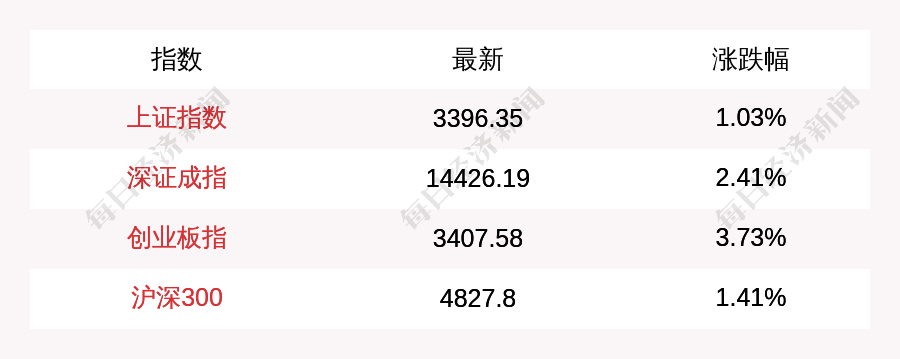 每经AI快讯:北京时间7月29日11:30,上证指数午盘上涨34.76点,涨幅为1.03%,报收3396.35点,成交额3192.36亿元;深证成指上涨339.77点,涨幅为2.41%,报收14426.19点,成交额4243.53亿元;创业板指上涨122.66点,涨幅为3.73%,报收3407.58点,成交额1891.75亿元;沪深300上涨67.32点,涨幅为1.41%,报收4827.8点,成交额2441.83亿元。