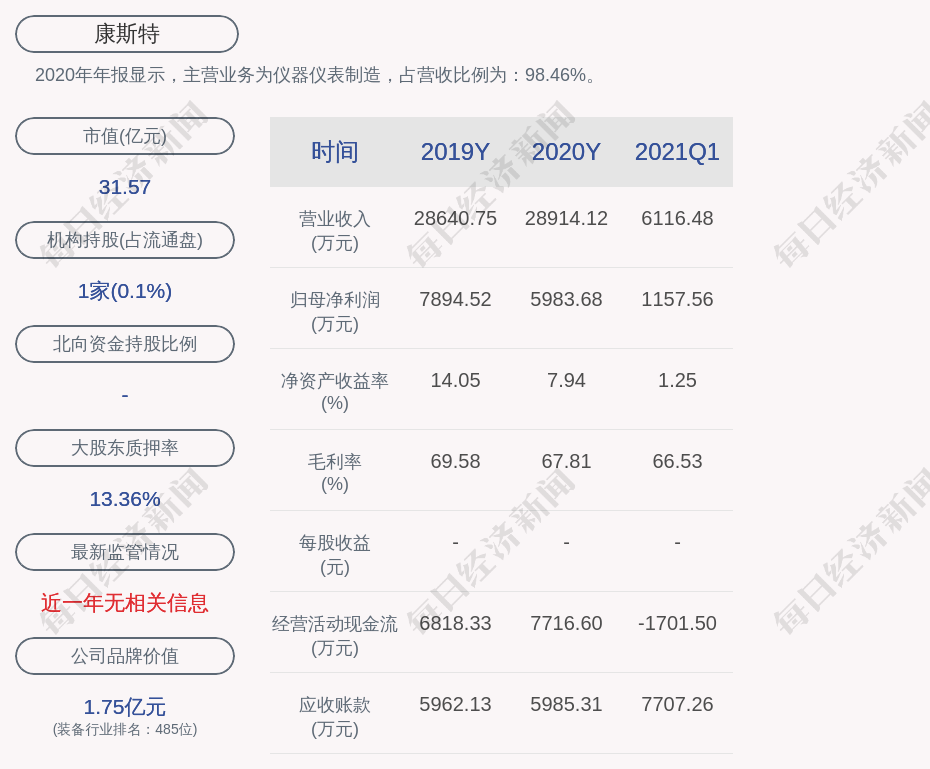 2020年年报显示,康斯特的主营业务为仪器仪表制造,占营收比例为:98.46%。