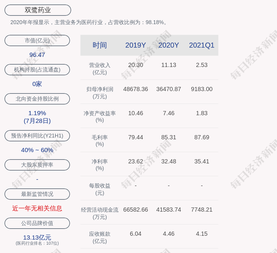 2020年年报显示,双鹭药业的主营业务为医药行业,占营收比例为:98.18%。