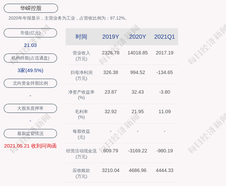2020年年报显示,华嵘控股的主营业务为工业,占营收比例为:97.12%。