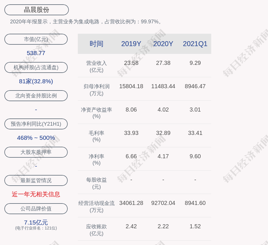 2020年年报显示,晶晨股份的主营业务为集成电路,占营收比例为:99.97%。