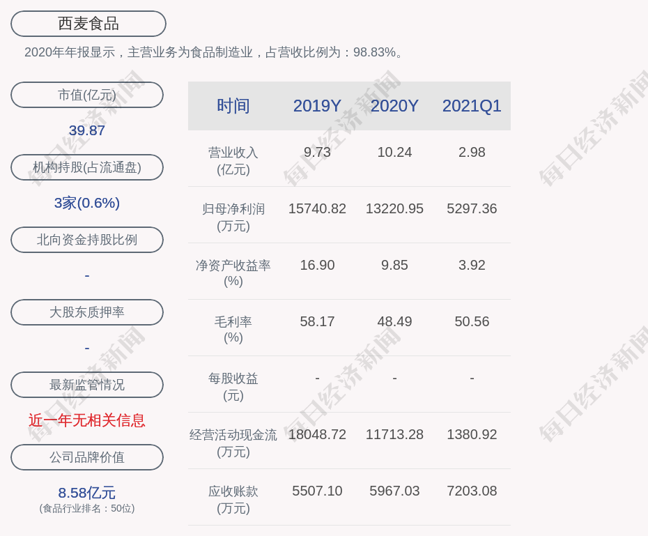 2020年年报显示,西麦食品的主营业务为食品制造业,占营收比例为:98.83%。
