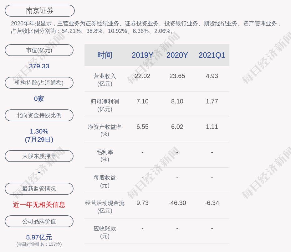 2020年年报显示,南京证券的主营业务为证券经纪业务、证券投资业务、投资银行业务、期货经纪业务、资产管理业务,占营收比例分别为:54.21%、38.8%、10.92%、6.36%、2.06%。