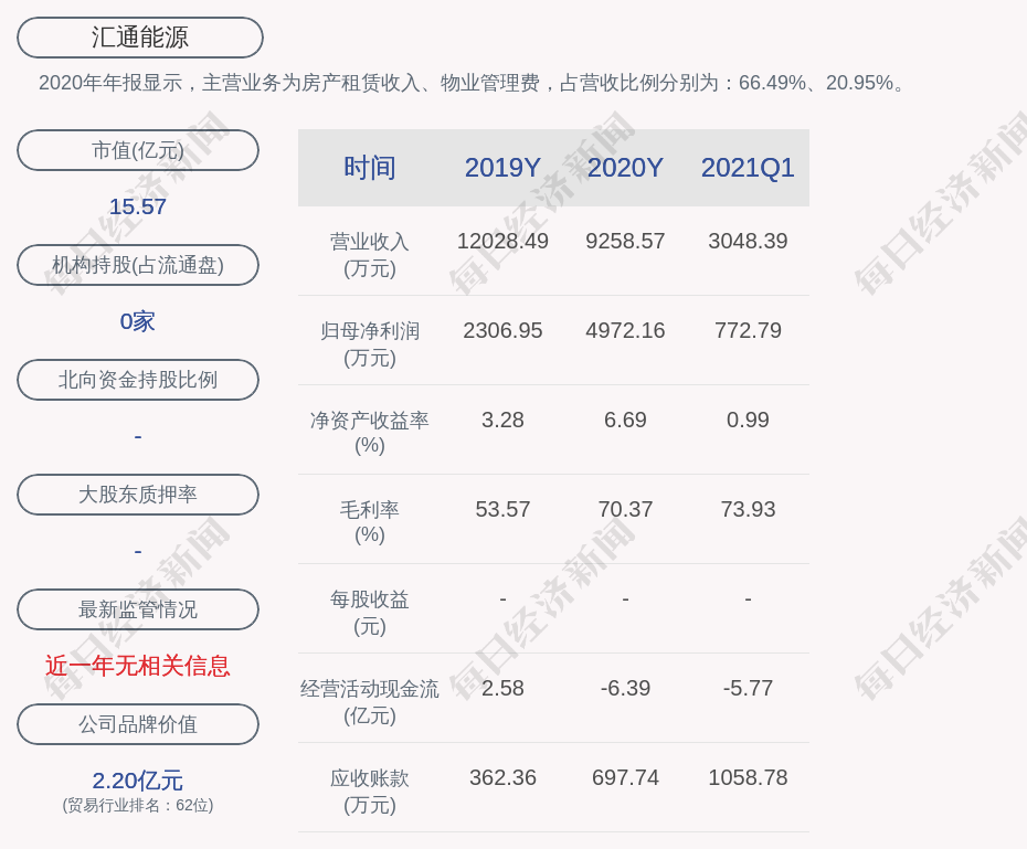 2020年年报显示,汇通能源的主营业务为房产租赁收入、物业管理费,占营收比例分别为:66.49%、20.95%。