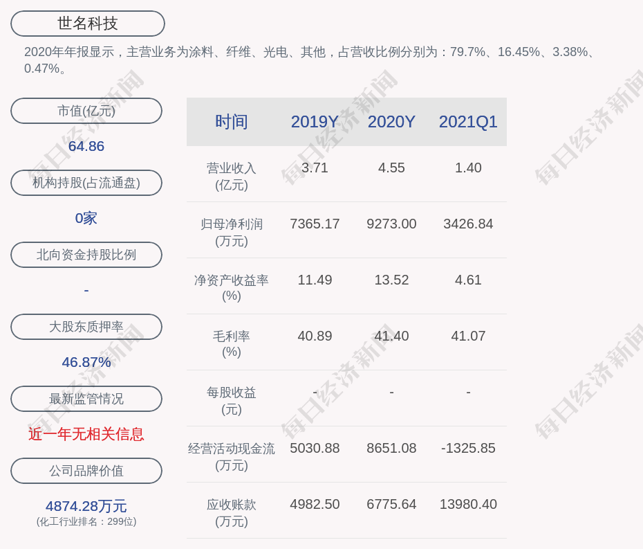 2020年年报显示,世名科技的主营业务为涂料、纤维、光电、其他。