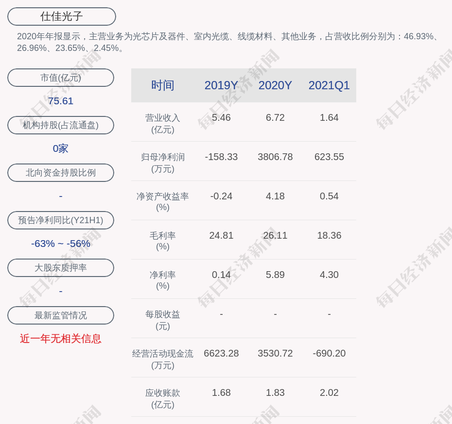 2020年年报显示,仕佳光子的主营业务为光芯片及器件、室内光缆、线缆材料、其他业务,占营收比例分别为:46.93%、26.96%、23.65%、2.45%。
