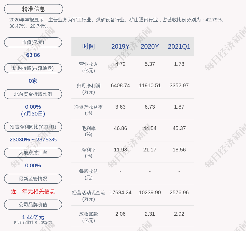 2020年年报显示,精准信息的主营业务为军工行业、煤矿设备行业、矿山通讯行业,占营收比例分别为:42.79%、36.47%、20.74%。