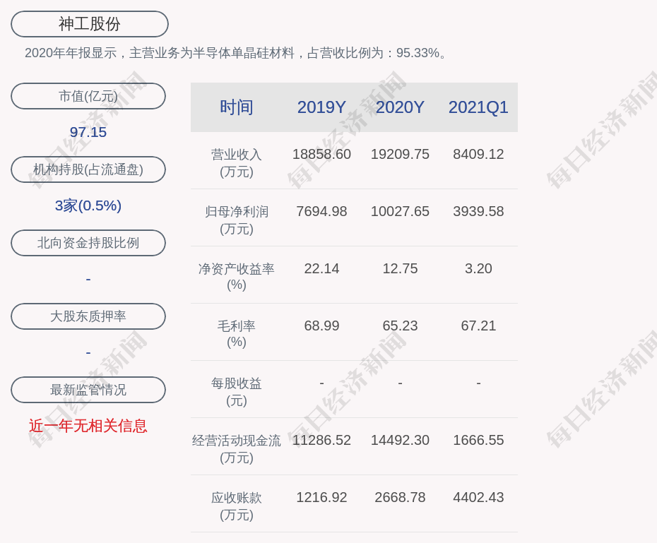 2020年年报显示,神工股份的主营业务为半导体单晶硅材料,占营收比例为:95.33%。