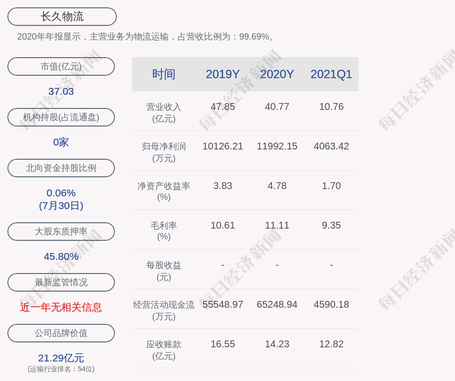 2020年年报显示,长久物流的主营业务为物流运输,占营收比例为:99.69%。
