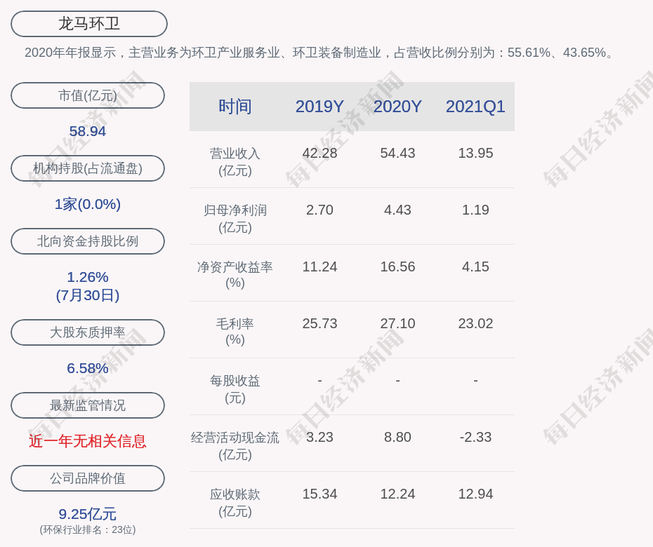 2020年年报显示,龙马环卫的主营业务为环卫产业服务业、环卫装备制造业,占营收比例分别为:55.61%、43.65%。