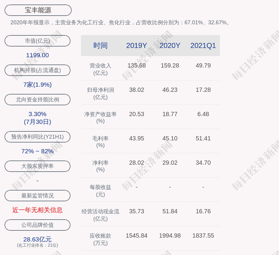 2020年年报显示,宝丰能源的主营业务为化工行业、焦化行业,占营收比例分别为:67.01%、32.67%。