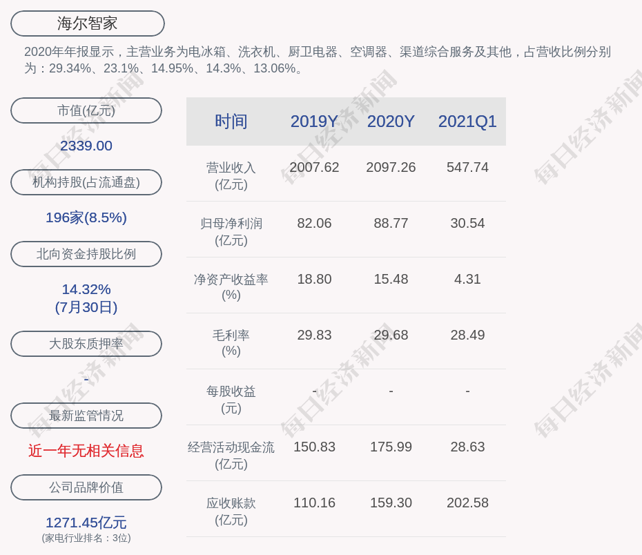 2020年年报显示,海尔智家的主营业务为电冰箱、洗衣机、厨卫电器、空调器、渠道综合服务及其他,占营收比例分别为:29.34%、23.1%、14.95%、14.3%、13.06%。
