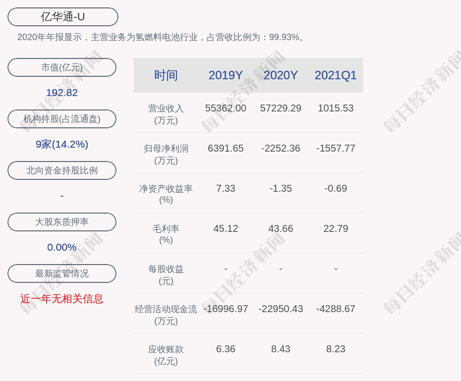 2020年年报显示,亿华通的主营业务为氢燃料电池行业,占营收比例为:99.93%。