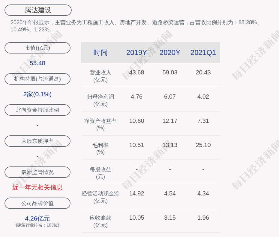 2020年年报显示,腾达建设的主营业务为工程施工收入、房地产开发、道路桥梁运营,占营收比例分别为:88.28%、10.49%、1.23%。