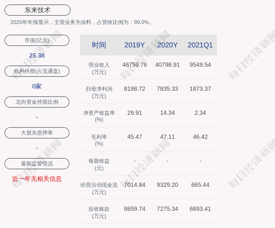 2020年年报显示,东来技术的主营业务为涂料,占营收比例为:99.0%。