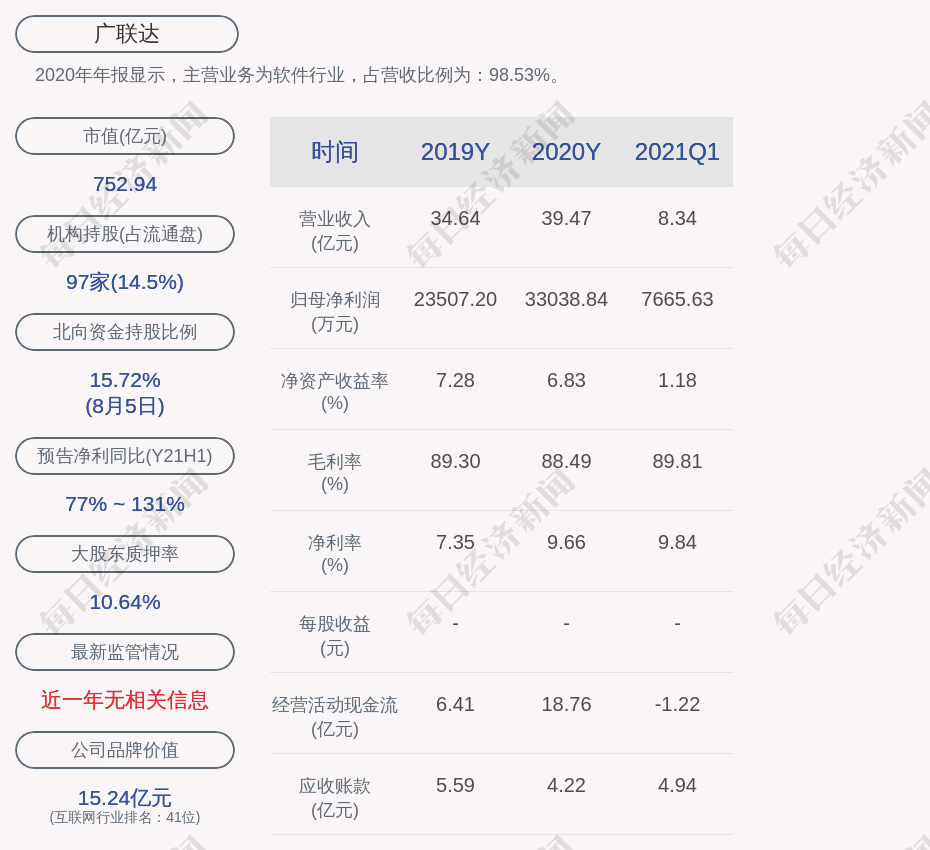 2020年年报显示,广联达的主营业务为软件行业,占营收比例为:98.53%。