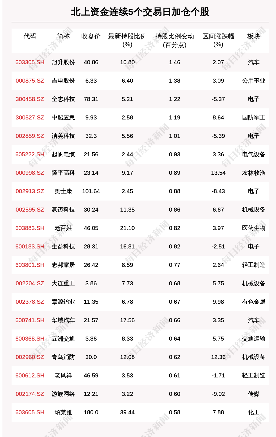 每经AI快讯,8月9日,北上资金连续5个交易日买入52个股。北上资金连续5个交易日加仓个股中,旭升股份(603305.SH,收盘价:40.86元)增持比例增幅最大,5个交易日增持1.46个百分点,其他增持比例较大的个股包括吉电股份(000875.SZ,收盘价:6.33元)、全志科技(300458.SZ,收盘价:78.31元)、中船应急(300527.SZ,收盘价:9.93元),分别增持1.38个百分点、1.22个百分点、1.19个百分点。