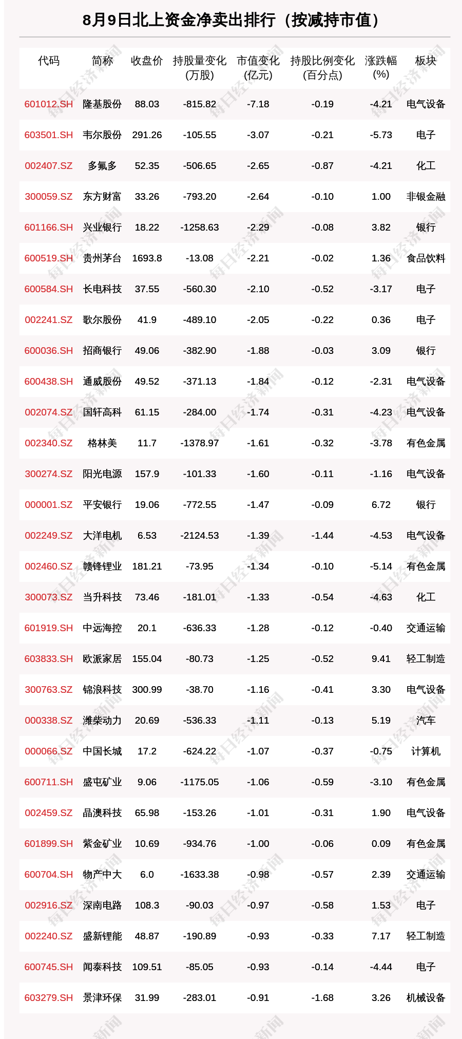 8月9日,按照北向资金减持市值排序,隆基股份(601012.SH,收盘价:88.03元)减持市值最大,减持市值7.182亿元,环比减少1.31%。其他北上资金减持市值较多的个股还包括韦尔股份(603501.SH,收盘价:291.26元)、多氟多(002407.SZ,收盘价:52.35元)、东方财富(300059.SZ,收盘价:33.26元)。