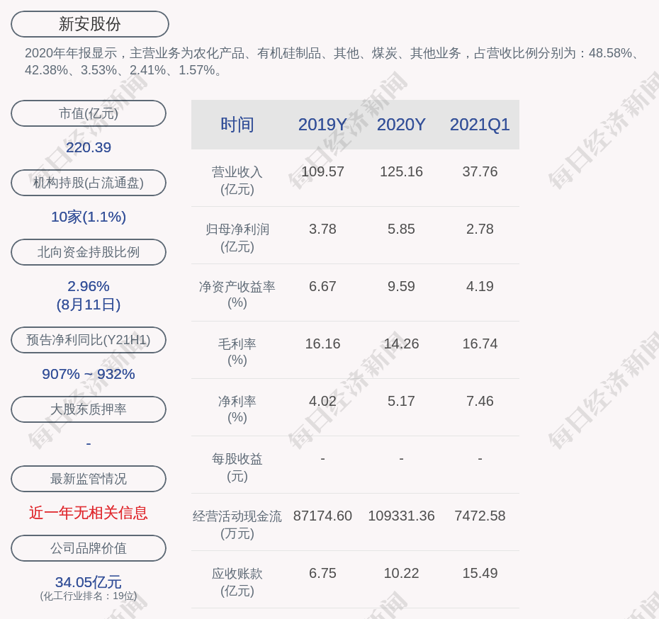 2020年年报显示,新安股份的主营业务为农化产品、有机硅制品、其他、煤炭、其他业务,占营收比例分别为:48.58%、42.38%、3.53%、2.41%、1.57%。
