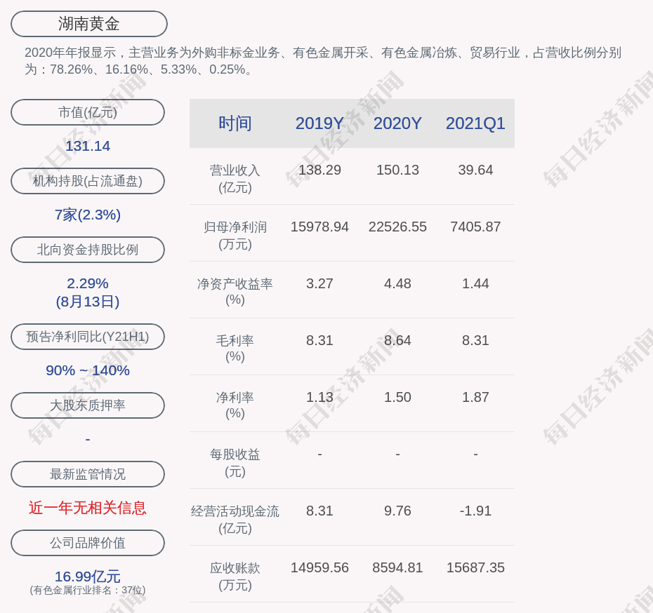 2020年年报显示,湖南黄金的主营业务为外购非标金业务、有色金属开采、有色金属冶炼、贸易行业,占营收比例分别为:78.26%、16.16%、5.33%、0.25%。