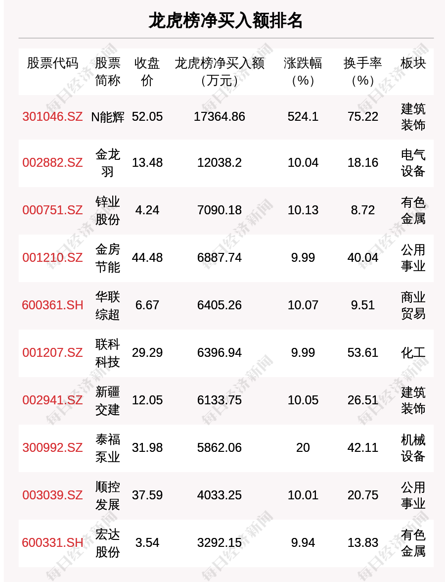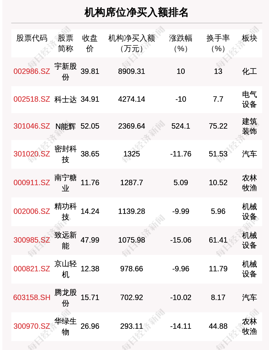 在龙虎榜中,涉及机构专用席位的个股有21只,净买入额前三的是宇新股份、科士达、N能辉,分别为8909.31万元、4274.14万元、2369.64万元。