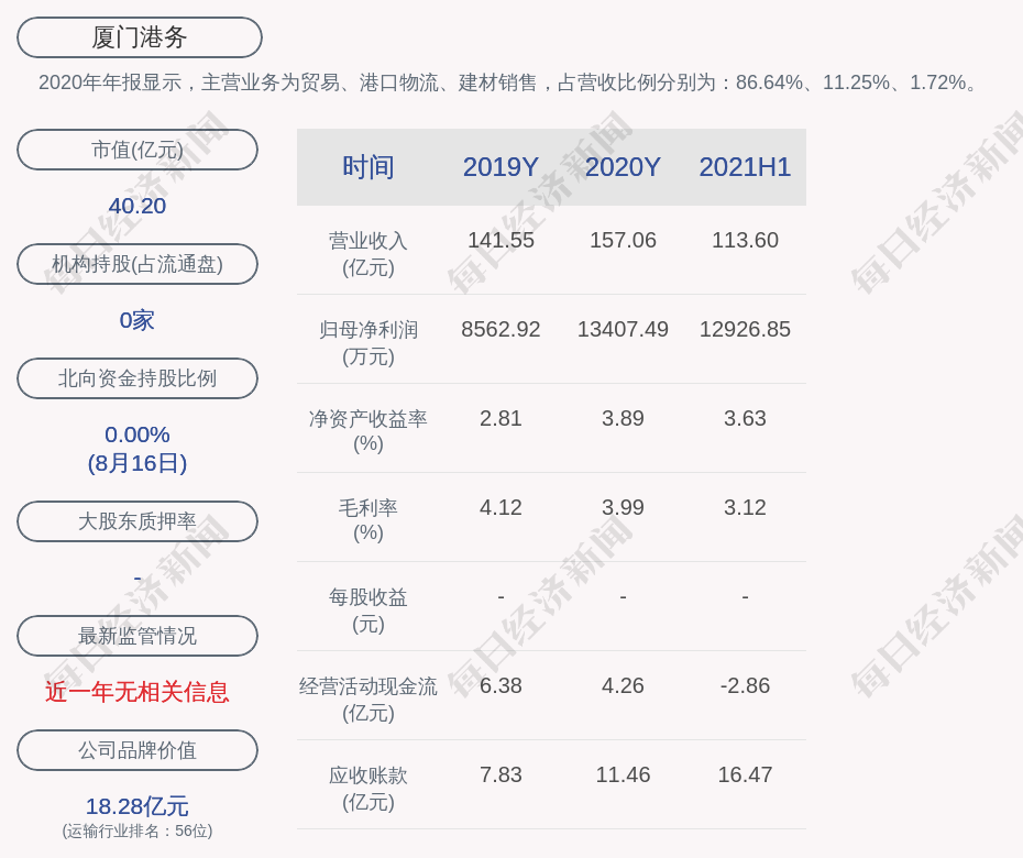 2020年年报显示,厦门港务的主营业务为贸易、港口物流、建材销售,占营收比例分别为:86.64%、11.25%、1.72%。
