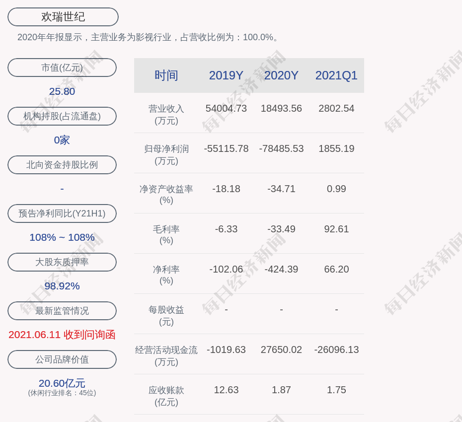 2020年年报显示,欢瑞世纪的主营业务为影视行业,占营收比例为:100.0%。