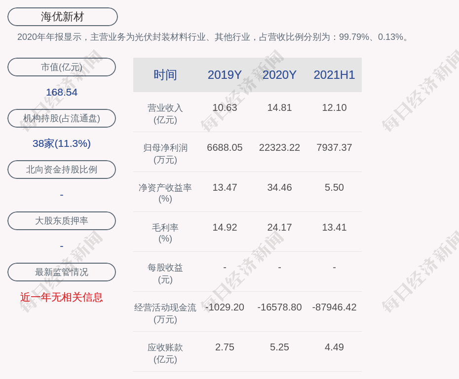 2020年年报显示,海优新材的主营业务为光伏封装材料行业、其他行业,占营收比例分别为:99.79%、0.13%。