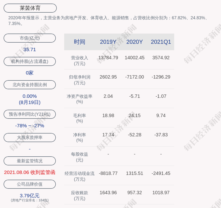 2020年年报显示,莱茵体育的主营业务为房地产开发、体育收入、能源销售,占营收比例分别为:67.82%、24.83%、7.35%。