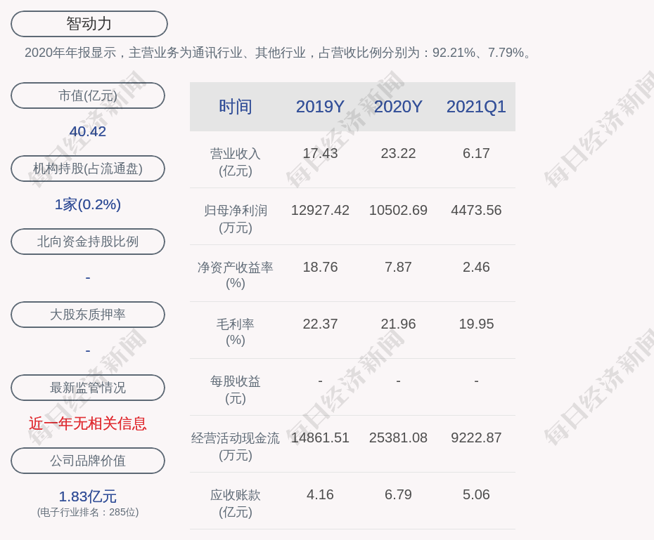 2020年年报显示,智动力的主营业务为通讯行业、其他行业,占营收比例分别为:92.21%、7.79%。