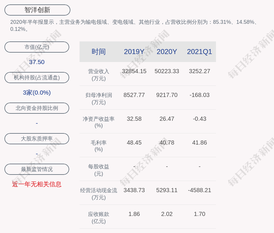 2020年半年报显示,智洋创新的主营业务为输电领域、变电领域、其他行业。