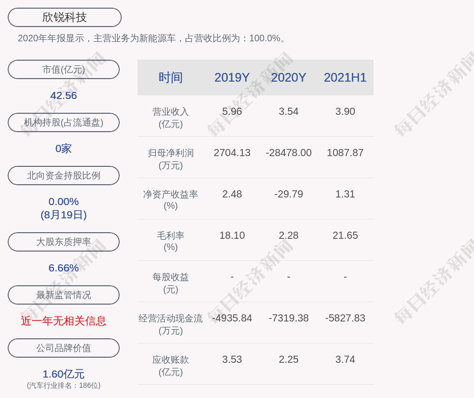 2020年年报显示,欣锐科技的主营业务为新能源车,占营收比例为:100.0%。