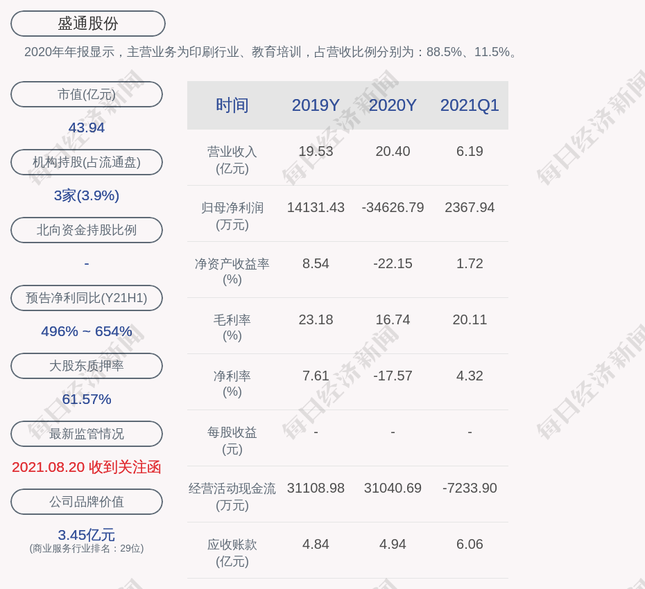 2020年年报显示,盛通股份的主营业务为印刷行业、教育培训,占营收比例分别为:88.5%、11.5%。